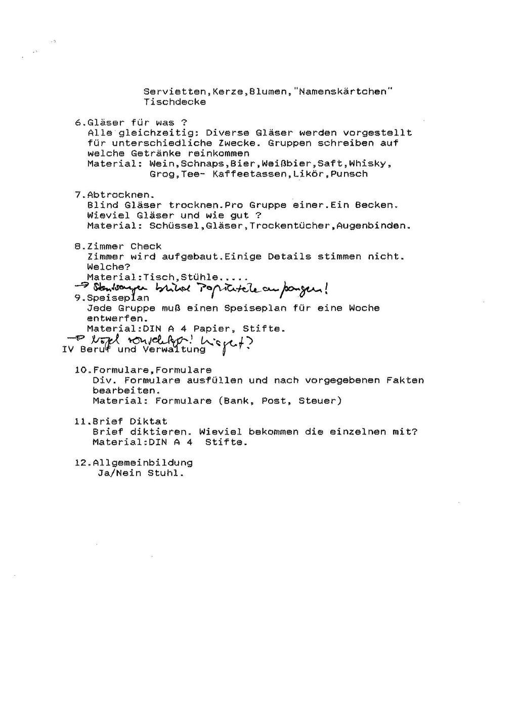 S6rviatt6n,K6rz6,Blumsn,"Namen$kärtch6n" Tiächdaaka„Gläswr für wasAlla gleichzeitig: Diverse Gläser wmrdan vorgastallt für unterschisdlichm Zwecke. Gruppwn schrsiban auf walcha Getränke reinkommen Material: wein,Schnape,Bier,weißbier,$aft,whisky, Grog„Tee~ Kaffeetaeeen,Likör,Punech.Abtrecknen.Blind Gläser tr0cknen„Pro Gruppe einer.Ein Becken„ wieviel Gläser und wie gut Material: $chussel,G1aser,Trookentüener,Augenbinden„.Zimmer CheckZimmer wird aufgebaut„Einige Details stimmen nicht. welche? Material:Tiech,$tühle. & b•.¢•r¤~·~ m.„‘»¢ " ‘c„ /¤¤—?«,,! mmiammm , ¤[\/I · ‘***7 9«S}»/bJJ„~$> §'Jpl„L¢ZI| Jede Gruppe muß einen Speiseplan für eine woche entwerfen. Material:DIN A 4 Papier, Stifte, ‘*° X/:4% ~0»uc€..0?~.’ LA; 5 IV Beru und Verwa tung QÄ4”%*10 ll 12.Pormulare,FormulareDiv. Formulare ausfüllen und nach vorgegebenen Fakten bearpeiten„ Material: Formulare (Bank, Poet, Steuer).Brief DiktatBrief diktieren„ wieviel bekommen die einzelnen mit? Material:DIN A 4 Stifte..AllgemeinbildungJa/Nein Gtuhl.
