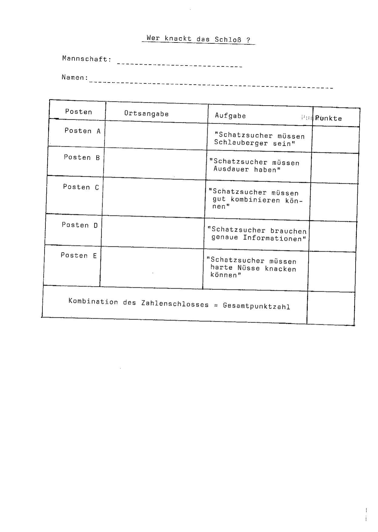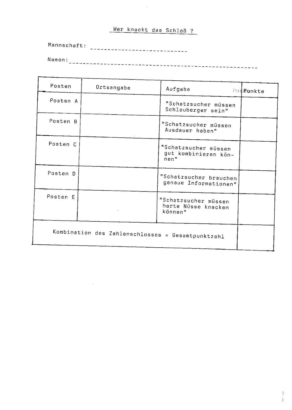 Wer knackt das Schloß Mannschaft: Namen: Posten Ortsangabe Aufgabe PumPunkte Posten A "Schatzsucher müssen Schlauberger sein" Posten B "Schatzsucher müssen Ausdauer haben" Posten C "Schatzsucher müssen gut kombinieren kön- nen" Posten D "Schatzsucher brauchen genaue Informationen" Posten E "Schatzsucher müssen harte Nüsse knacken können" Kombination des Zahlenschlosses = Gesamtpunktzahl