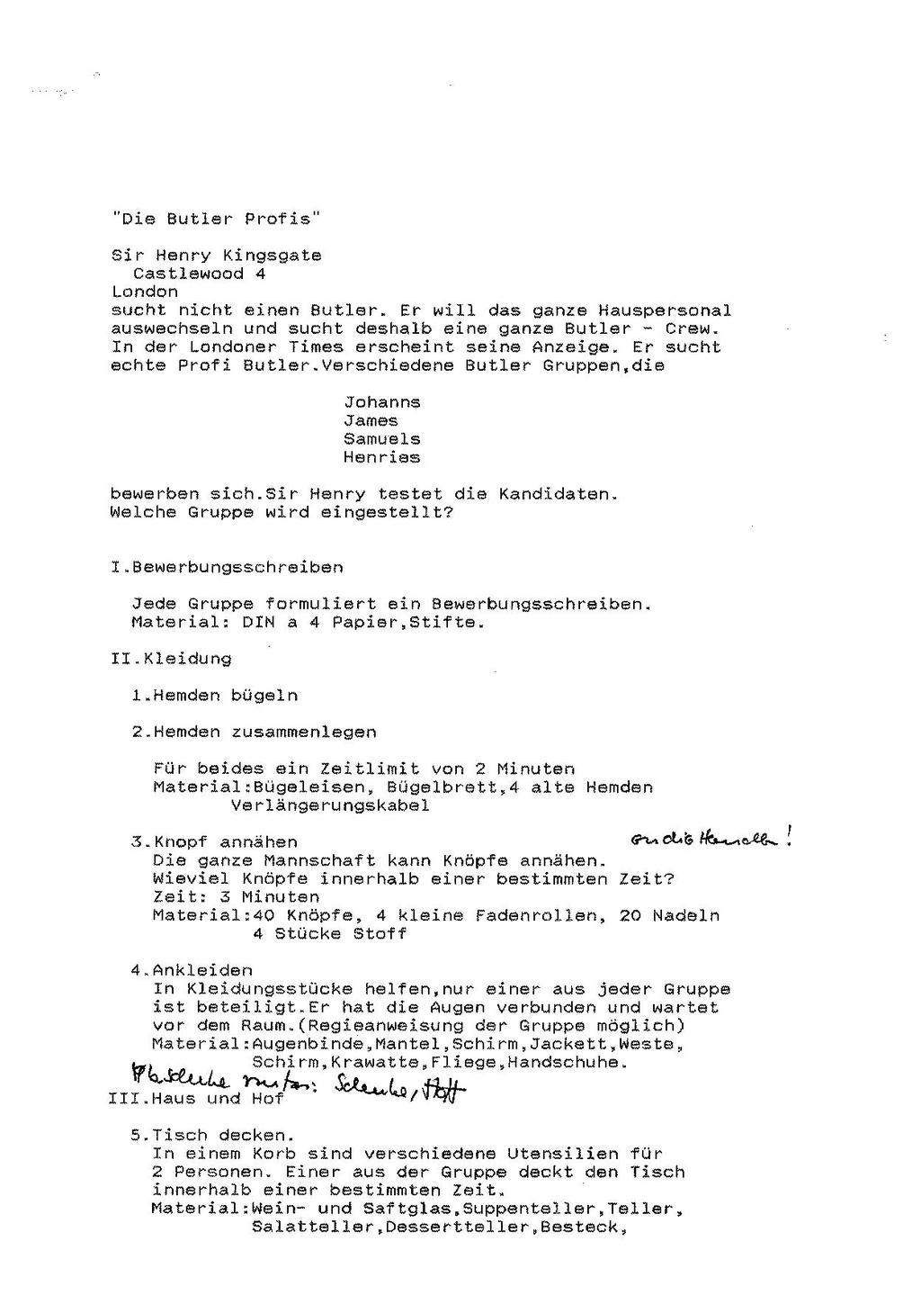 Sir Henry Kingsgate Castlewood 4 London sucht nicht einen Butler. Er will das ganze Hauspersonal auswechseln und sucht dashalb eine ganze Butler - Crew. In der Londoner Times erscheint seine Anzeige. Er sucht echte Profi Butler„Vers0hiedene Butler Gruppen,die Jehanns James Bamuels Henriee bewerben sich„Sir Henry testet die Kandidaten„ welche Gruppe wird eingestellt? I.Bewerbungeschreiben Jede Gruppe formuliert ein Bewerbungeschreiben„ Material: DIN a 4 Papier,3tifte. II„Kleidung.Hemden bügeln.. Hümdüü ZUS8mm@I’°Il@Q8I’1Fur beides ein Zeitlimit von 2 Minuten Materialcßugeleieen, Bugelbrett,4 alte Hemden verlängerungekebel cmouc !k»„.„¤„¢6„„Knopt annahenDie ganze Manneehaft kann Knöpfe annahen„ wieviel Knöpfe innerhalb einer bestimmten Zeit? Zeit: 3 Minuten Material:4O Knöpfe, 4 kleine Fadenrellen, 20 Nadeln 4 Stücke Stoff„AnkleidenIn Kleidungsstücke helfen,nur einer aus jeder Gruppe ist beteiligt„Er hat die augen verbunden und wartet vor dem Raum.(Regieanweisung der Gruppe möglich) Material:eugenbinde,Mantel,Schirm,Jaekett,weste, VRMMQ Schirm , Krawatte , Fliege , Handschuhe „ Tha ~ ‘ * II„Haus und Het ” &db“”aß/ Jiüp„Tisch decken,In einem Korb sind verschiedene Utensilien für 2 Personen. Einer aus der Gruppe deckt den Tisch innerhalb einer bestimmten Zeit, Material:wein~ und Saftglas,Suppenteller,Teller, Balatteller,Dessertteller,Besteck,